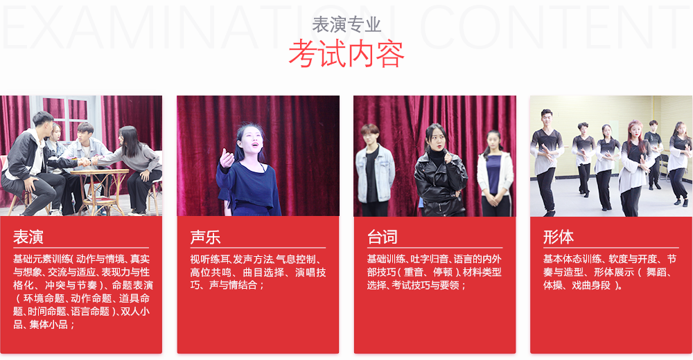 | 強化班 | 9.1-9.26 | 強化學生戲劇意識、找到符合邏輯的表演規律,使所塑造的人物更加真實、生動、有特點。 |