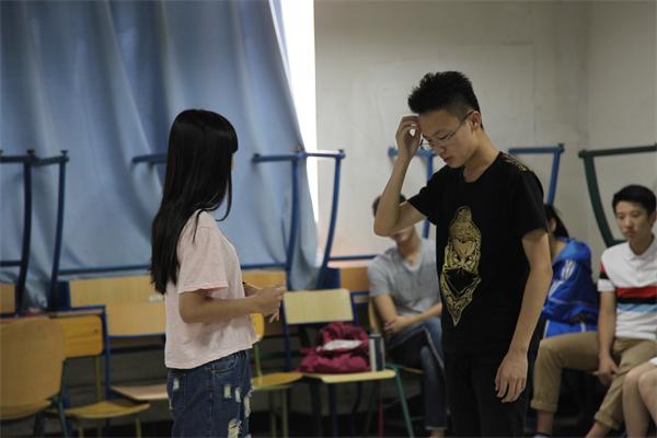 在課堂上,第一個小組的兩位同學按照老師提前講到的要求以及自己的體會進行表演,但是結果并不令人滿意,演員們的表達似乎并沒有放開。“你現在是在一個車站等女朋友,車站的環境比較嘈雜,在這樣的一個環境里等人最主要的一個特點就是‘找’,所以在肢體上和視線上都應該有所表達,但是你剛才的表演并沒有體現出等人的狀態。”宋老師對剛剛表演的男同學講到。