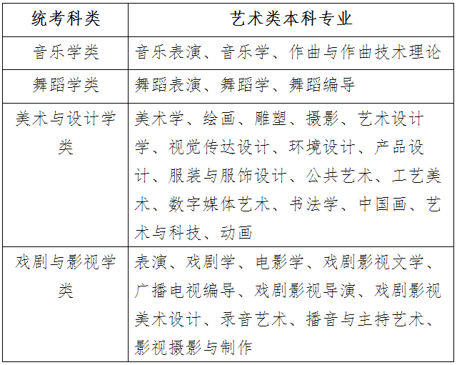 藝術類本科專業與藝術統考科類對應表(試行)
