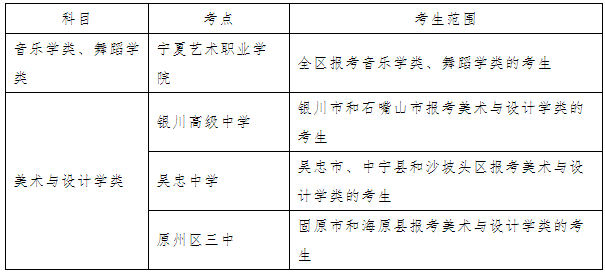 2017年普通高等學校招生藝術類專業統考音樂學類、舞蹈學類專業考點設在寧夏藝術職業學院(銀川市西夏區同心北街666號);美術與設計學類專業考點分片區集中進行,銀川市和石嘴山市的考生安排在銀川高級中學(銀川市興慶區清河北街海寶東路)考點參加美術與設計學類考試,吳忠市、中寧縣和沙坡頭區的考生安排在吳忠中學(吳忠市利通區吳忠汽車站東側500米)考點參加美術與設計學類考試,固原市和海原縣的考生安排在原州區三中(固原市原州區文化東街9號)考點參加美術與設計學類考試。