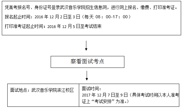 (5)考生應于2016年12月6日下午到武漢音樂學院濱江校區查看考點,了解有關考試注意事項。考試的相關信息和規定將在湖北省教育考試院網、武漢音樂學院招生信息網和考試現場公告欄公布。如有變化,以考試現場公告為準。