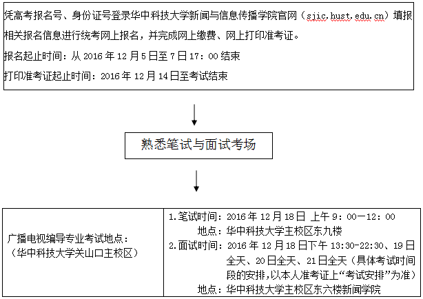已在高考網(wǎng)報(bào)時(shí)選報(bào)了戲劇與影視學(xué)類廣播電視編導(dǎo)專業(yè)的考生,請(qǐng)于2016年12月5日8:30至12月7日17:00,憑高考報(bào)名號(hào)及身份證號(hào)登錄華中科技大學(xué)新聞與信息傳播學(xué)院官網(wǎng)(sjic.hust.edu.cn),填報(bào)相關(guān)報(bào)名信息進(jìn)行專業(yè)科目統(tǒng)考網(wǎng)上報(bào)名并完成網(wǎng)上繳費(fèi)。請(qǐng)考生合理安排時(shí)間,務(wù)必在規(guī)定時(shí)間內(nèi)完成網(wǎng)上報(bào)名和網(wǎng)上繳費(fèi),網(wǎng)上報(bào)名系統(tǒng)關(guān)閉后不再安排補(bǔ)報(bào)。