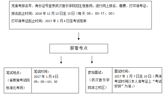 7.考生應于2017年1月6日下午察看熟悉考點,了解有關考試注意事項。考試的相關信息和規定將在湖北省教育考試院網、武漢音樂學院招生信息網和考試現場公告欄公布。如有變化,以考試現場公告為準。