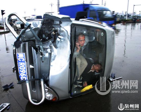 2005年4月12日下午,晉江電信大樓十字路口處,一輛面包車與皮卡車相撞,面包車當場被撞翻倒地。在翻倒的小車內,司機被擠壓在下,車主狼狽地打著手機,向外發出求救信號。