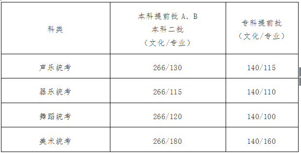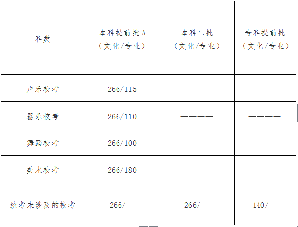 ⑴按教育部規(guī)定,部分獨立設置的藝術院校和參照執(zhí)行的院校(或?qū)I(yè))藝術類本科專業(yè),文化、專業(yè)錄取控制線由學校自行確定,我省統(tǒng)考涉及到的專業(yè),還需要我省相應類別專業(yè)統(tǒng)考合格。其藝術類??茖I(yè):我省統(tǒng)考涉及的,文化、專業(yè)錄取控制線按我省相應統(tǒng)考類執(zhí)行;我省統(tǒng)考未涉及的,文化控制線為140分,專業(yè)控制線由院校確定。