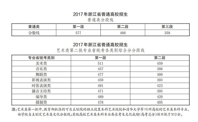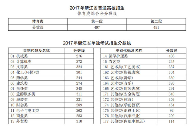 一、2017 年浙江省普通高校招生各類別分段線