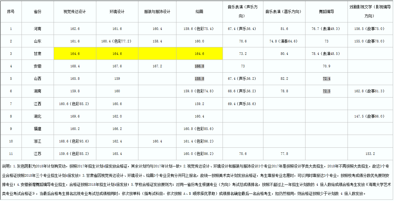 根據《教育部辦公廳關于做好2018年普通高等學校部分特殊類型招生工作的通知》(教學廳【2017】15號)、《海南大學2018年藝術類本科專業招生簡章》、11個校考省份上報合格考生信息通知和相關招生考試文件,確定海南大學2018年藝術類專業招生考試合格分數線如下:
