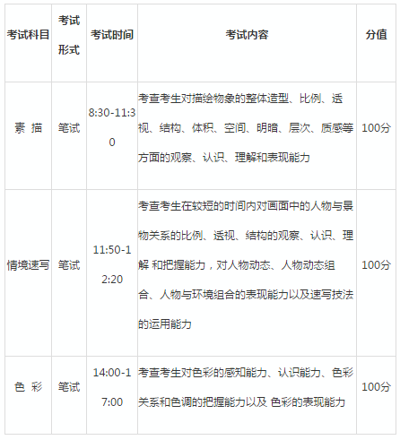 考試共設3個科目,分別考察考生的造型能力及色彩表現(xiàn)能力、形象記憶及閱讀與想象力。專業(yè)成績滿分為300分。考試科目具體分值如下: