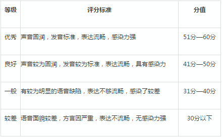 考察考生是否具有學習播音主持專業的基礎,包括音質、語音、表達、體態四個方面。分為四個等級:
