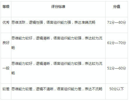 考察考生是否具有一定的思辨能能力、知識積累以及語言組織能力、現場應變能力和良好的心理素質。分為四個等級: