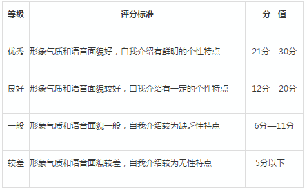 考生進行自我介紹的同時考察其所具備的五官、身高、氣質等外形方面的基本條件(要求:1.身材勻稱,比例協調,五官端正,氣質較好。原則上,男生身高1.70米,女生身高1.60米以上;2.舉止自然大方,反應敏捷得體)。分四個等級: