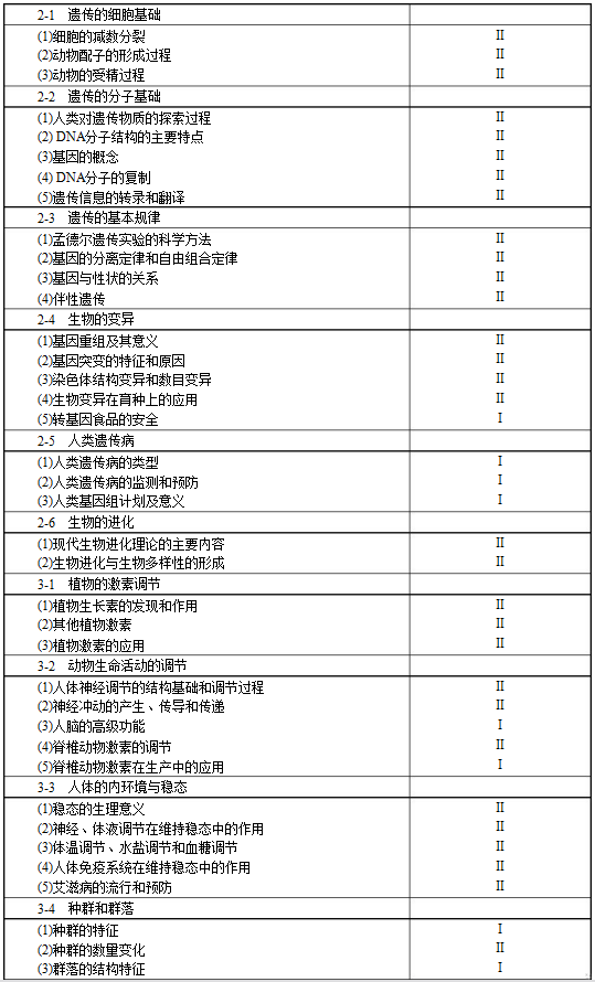 生物學科的考試范圍包括必考部分和選考部分,必考部分在課程標準必修模塊的范圍內,選考部分在課程標準選修模塊 1(生物技術實踐)和選修模塊 3(現代生物科技專題)的范圍內。必考部分的試題是考生必做的,選考部分的試題需要考生在規定的選考內容中選擇。生物學科的考試內容以知識內容表的形式呈現。知識內容要求掌握的程度,在知識內容表中用Ⅰ和Ⅱ標出;實驗內容要求掌握的程度則用文字說明。Ⅰ和Ⅱ的含義如下。