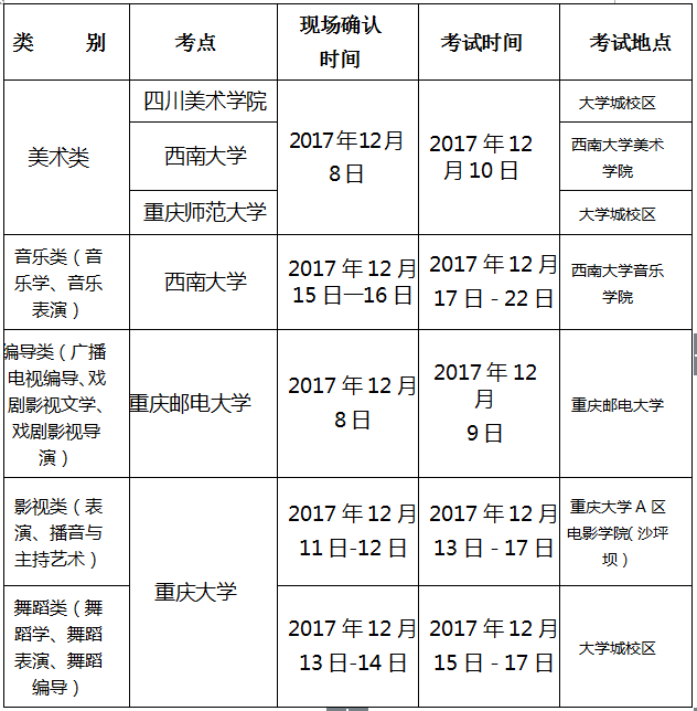 需要在我市單獨設(shè)點進行藝術(shù)專業(yè)考試的市外院校,須在2017年12月20日前向重慶市教育考試院提出書面申請并填寫校考信息登記表(附件5),經(jīng)同意后方能進行,市內(nèi)外高校在渝組織專業(yè)校考的時間按照教育部的要求須安排在2018年春節(jié)之后進行。未經(jīng)重慶市教育考試院同意,不得擅自組織或在上述考點以外設(shè)置考點進行專業(yè)考試。為加強監(jiān)督檢查,來渝設(shè)點的高校必須在重慶市教育考試院指定的考點進行專業(yè)考試,考點設(shè)置如下: