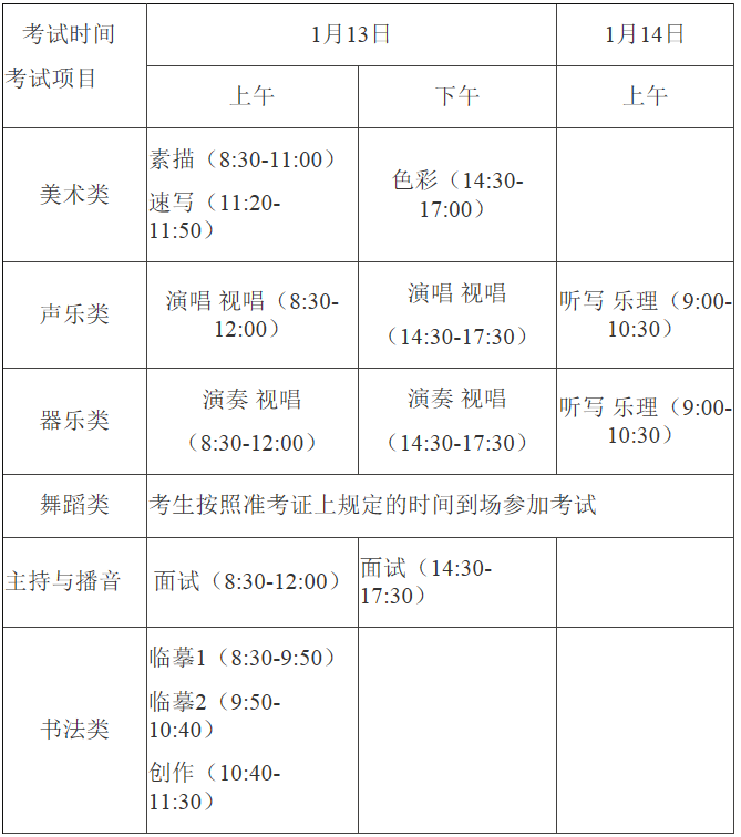 報考藝術類專業考試的考生須先參加藝術類的專業考試,再參加6月7日至9日文史類的普通高等學校招生全國統一考試(文化考試)。其中,藝術類專業的省級統考安排如下: