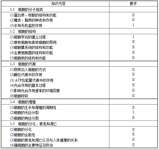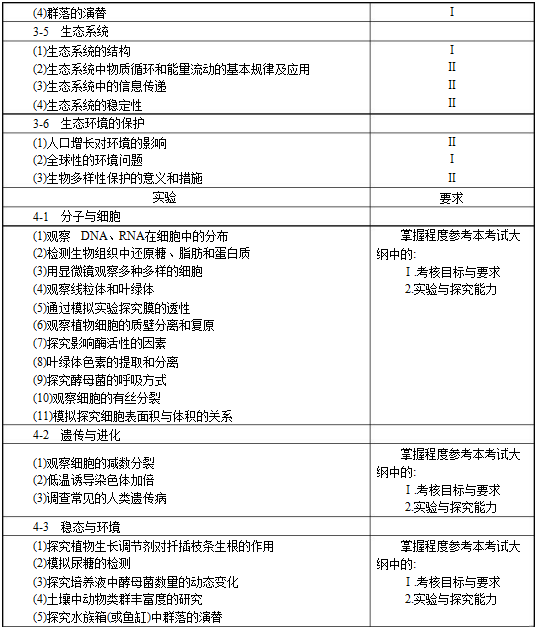 生物學科的考試范圍包括必考部分和選考部分,必考部分在課程標準必修模塊的范圍內,選考部分在課程標準選修模塊 1(生物技術實踐)和選修模塊 3(現代生物科技專題)的范圍內。必考部分的試題是考生必做的,選考部分的試題需要考生在規定的選考內容中選擇。生物學科的考試內容以知識內容表的形式呈現。知識內容要求掌握的程度,在知識內容表中用Ⅰ和Ⅱ標出;實驗內容要求掌握的程度則用文字說明。Ⅰ和Ⅱ的含義如下。
