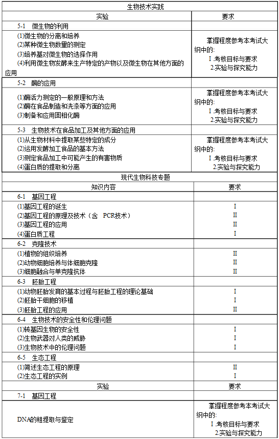 根據普通高等學校對新生文化素質的要求,依據中華人民共和國教育部 2003年頒布的《普通高中課程方案(實驗)》和《普通高中生物課程標準(實驗)》,將課程標準的必修及部分選修內容,確定為高考理工類生物學科的考試內容。