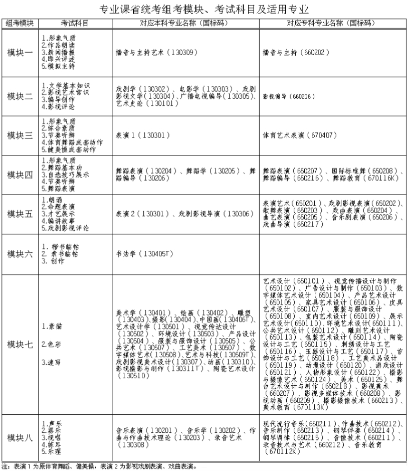 2.專業(yè)課全省統(tǒng)一考試(以下簡稱省統(tǒng)考)報(bào)名。按照教育部頒布的藝術(shù)基礎(chǔ)科類與本科專業(yè)對應(yīng)表,各專業(yè)省統(tǒng)考根據(jù)其考試科目(相同或相近)共設(shè)置8個(gè)組考模塊(各模塊對應(yīng)的專業(yè)詳見附件),藝術(shù)類考生必須選擇1個(gè)與所報(bào)專業(yè)相對應(yīng)的統(tǒng)考模塊參加專業(yè)課省統(tǒng)考。藝術(shù)類考生在文化課高考報(bào)名的同時(shí),還須完成專業(yè)課網(wǎng)上報(bào)名手續(xù)??忌梢约鎴?bào)不同模塊的考試。