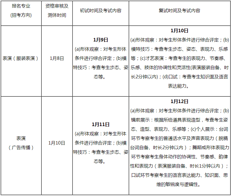 表演類校考的專業(yè)為表演(服裝表演)、表演(廣告?zhèn)鞑?,考生只能在以上專業(yè)方向中選擇1個報考,考生須在本省藝術類相應類別統(tǒng)考本科合格基礎上參加校考,否則校考成績無效,省統(tǒng)考未涉及到的除外。