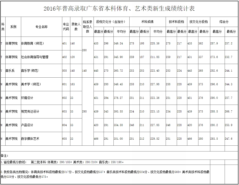 2016年廣東第二師范學(xué)院普高錄取廣東省本科體育、藝術(shù)類新生成績統(tǒng)計表