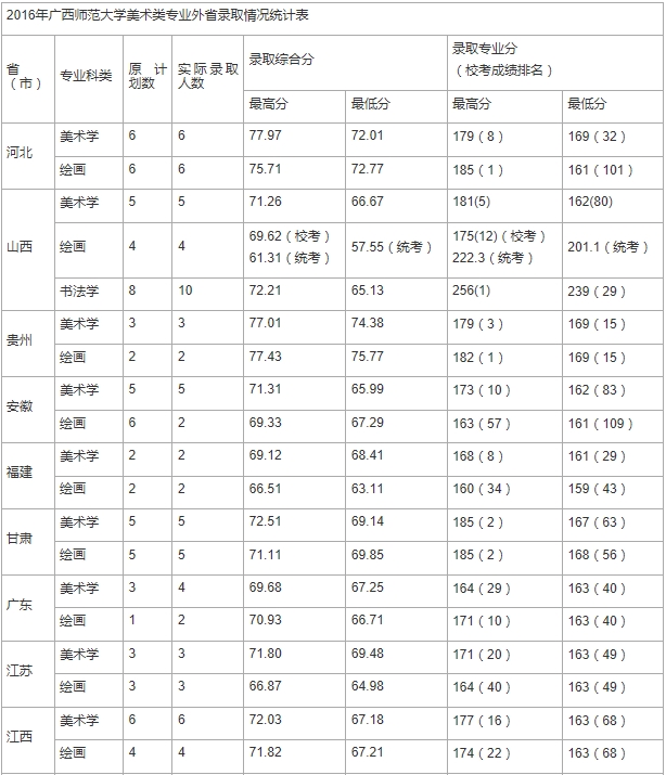 2016年廣西師范大學藝術類專業外省錄取情況統計表