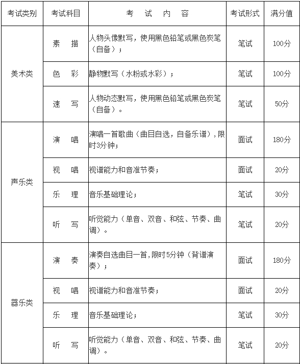 3.器樂類專業(yè)考試科目:演奏(器種不限)、視唱、樂理、聽寫。
