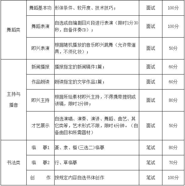 5.主持與播音類專業(yè)考試科目:新聞播報(bào)、作品朗讀、即興主持、才藝展示。