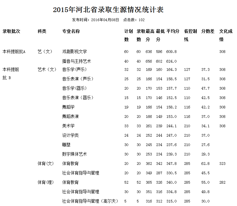 戲劇影視文學專業考生文化課成績達到所在省編導類文化錄取控制分數線以上,按文化與專業成績之和排序從高到低錄取。 2015年河北省錄取生源情況統計表: