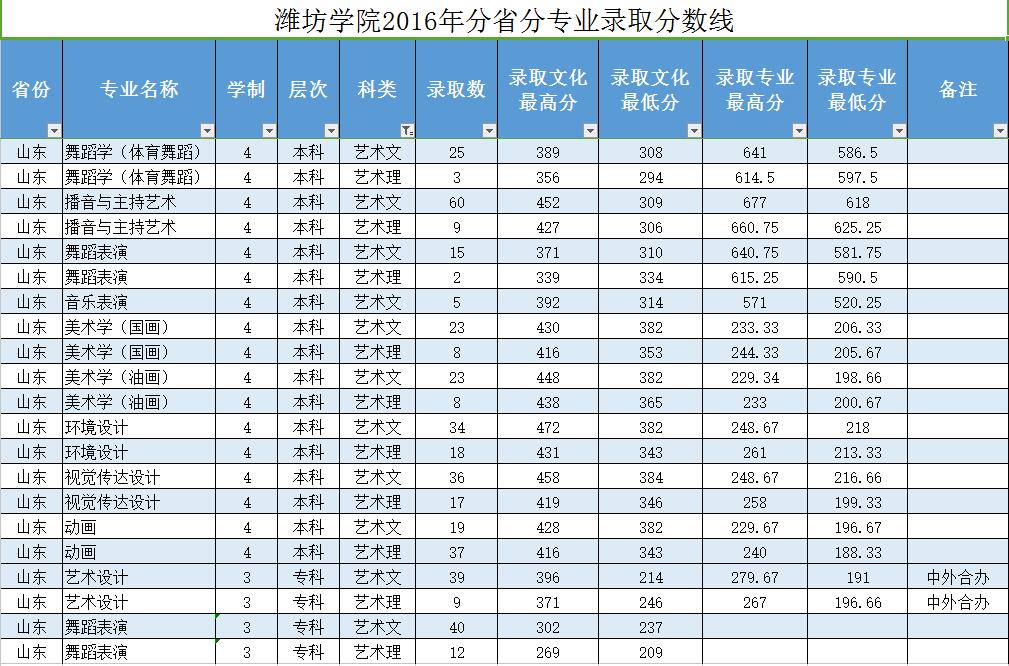 濰坊學院2016年分省份專業錄取分數線