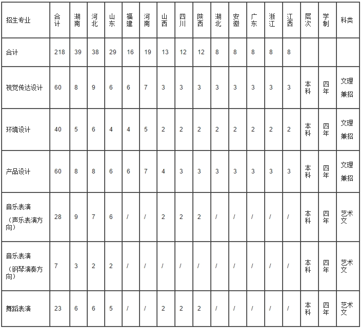 2017年我校視覺傳達設計、環境設計、產品設計三個設計學類專業招生計劃總數為160名,在河北、山東、福建、河南4省組織專業校考招生,在湖南、山西、四川、陜西、湖北、安徽、廣東、浙江、江西9省根據省級統考成績招生;音樂表演和舞蹈表演兩個專業招生計劃總數為58名,在湖南、河北、山東3省組織專業??颊猩?,在山西、四川、陜西3省根據省級統考成績招生。