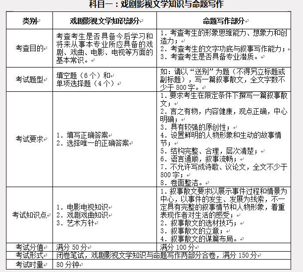 戲劇影視文學(xué)專業(yè)招生考試由下面兩門科目的筆試組成,滿分300分。