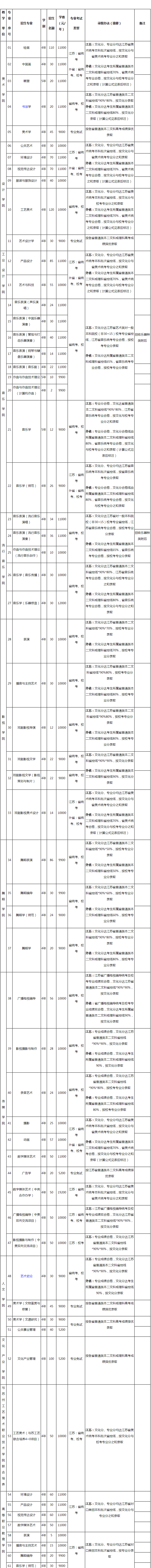 5、高等職業(yè)教育學(xué)院各專業(yè)只面向江蘇招收對口單招考生,其他學(xué)院藝術(shù)類專業(yè),除數(shù)字媒體藝術(shù)(中英合作辦學(xué))、廣播電視編導(dǎo)(中美雙向交流項(xiàng)目)、影視攝影與制作(中美雙向交流項(xiàng)目)專業(yè)只招收江蘇省藝術(shù)類考生外,均面向全國招生;