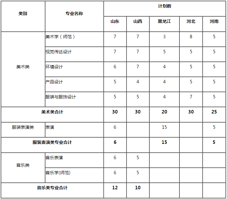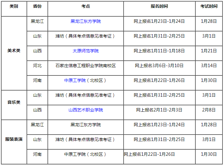 (2)黑龍江省:美術類(校考)專業只招文科考生,表演(校考)專業文理兼招;山東省:美術類(校考)專業、音樂類(校考)專業只招文科考生,表演(校考)專業文理兼招;山西省:美術類(校考)專業、音樂類(校考)專業文理兼招;河北省:美術類(校考)專業文理兼招。河南省:美術類(校考)專業、表演(校考)專業文理兼招。各省參加校考的考生只有在所在省指定地點參加考試的成績有效,對在其他考點參加考試的成績不予承認;
