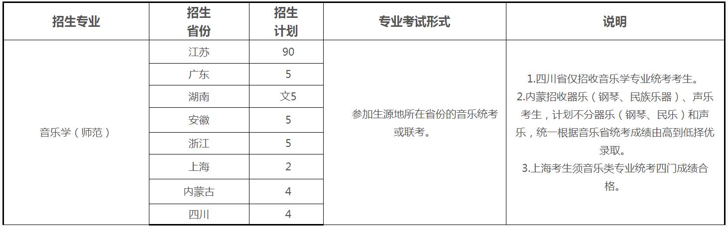 ②音樂學(師范)入校后只提供鋼琴、聲樂、民族樂器方向教學。注:①招生專業、計劃以生源地所在省(市)招生主管部門公布的為準;