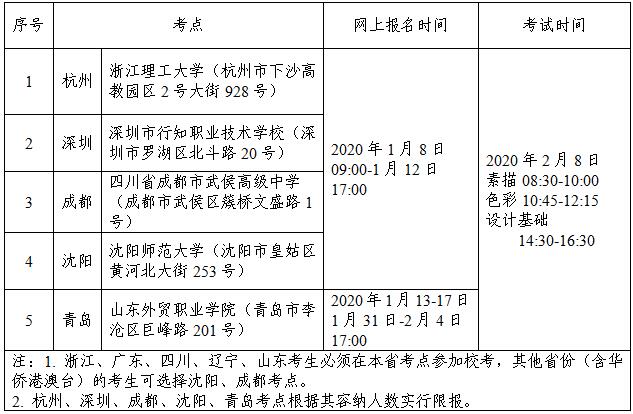 山東考生須按照山東省教育招生考試院的要求,于2020年1月13-17日、1月31日-2月4日17時兩個時間段登錄山東省教育招生考試院網站(網址:http://www.sdzk.cn)進行報名、交費,并于2020年2月6-7日再次登錄該網站打印校考準考證。