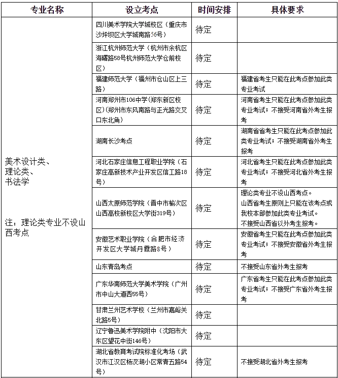 6、我校部分專業會在外省設立考點,具體考試時間安排待確定后將陸續公布,考生可根據自身實際情況選擇考點。凡考生高考所在省設有考點,考生只能在本省考點參加專業考試。外省考點所在省份有專門規定,考生須遵照執行。具體分布如下: