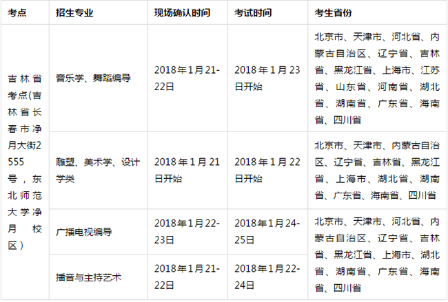 我校共設5個考點:吉林省考點、河北省考點、河南省考點、江蘇省考點、山東省考點。考生必須在高考所在省份的考點參加所設招生專業的報名、考試;若所在省份未設考點或者未設所報招生專業,考生必須在吉林省考點進行報名、考試。每個考生只允許報考一個專業。報考費200元。各考點報名和考試安排情況如下。