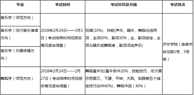 根據《山東省2018年普通高等學校藝術類專業招生工作實施方案》(魯教招字〔2017〕5號)規定,報考我校音樂學(師范方向)、音樂學(流行音樂演唱方向)、音樂學(樂器修繕方向)、舞蹈學(師范方向)專業的考生需參加我校組織的專業測試且成績合格。報考我校音樂教育(師范方向)專業的考生需參加我校或其他本科院校音樂學專業的專業測試且成績合格。