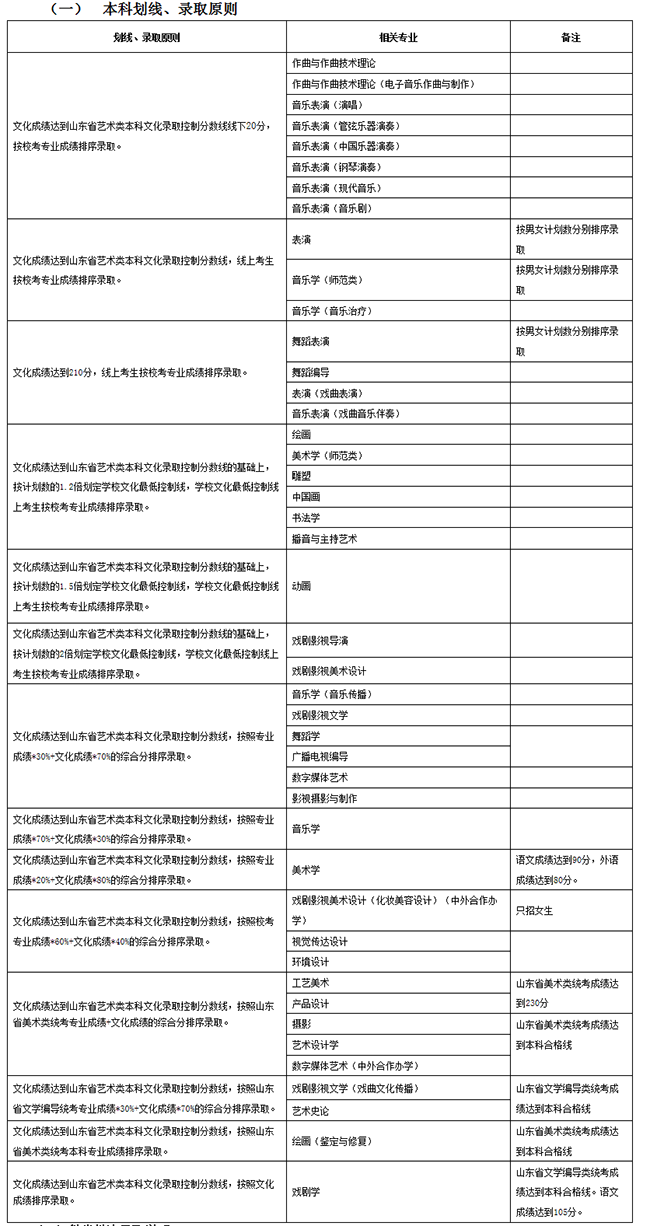 按照教育部及山東省有關規(guī)定,我校為獨立設置的本科藝術院校,可自行劃定文化錄取控制分數(shù)線。