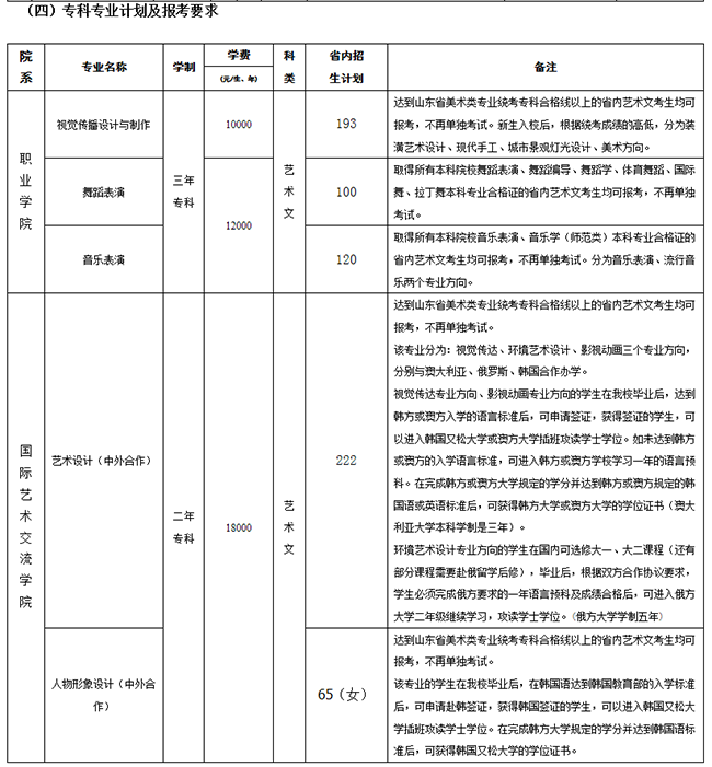 1.視覺傳播設計與制作、藝術設計(中外合作)、人物形象設計(中外合作)專科專業(yè)認同山東省美術類專業(yè)統(tǒng)考成績,錄取時依據(jù)文化成績與專業(yè)成績關聯(lián)投檔的辦法,按山東省美術類統(tǒng)考專業(yè)成績從高到低排序錄取。