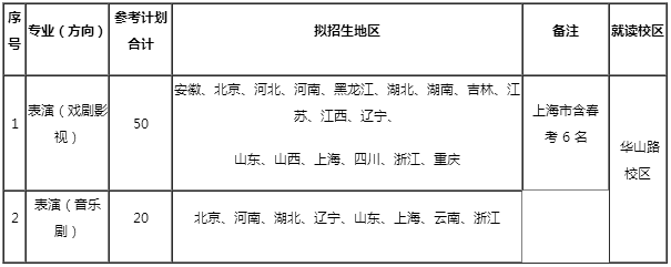 (四)除預科轉入、春季考試及“一本”批次招生專業以外,不作分省市計劃的專業(方向)全國統招, 藝術類文理兼收;表演(戲劇影視、音樂劇)專業在擬招生地區范圍內,藝術類文理兼收。