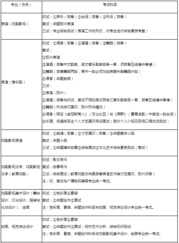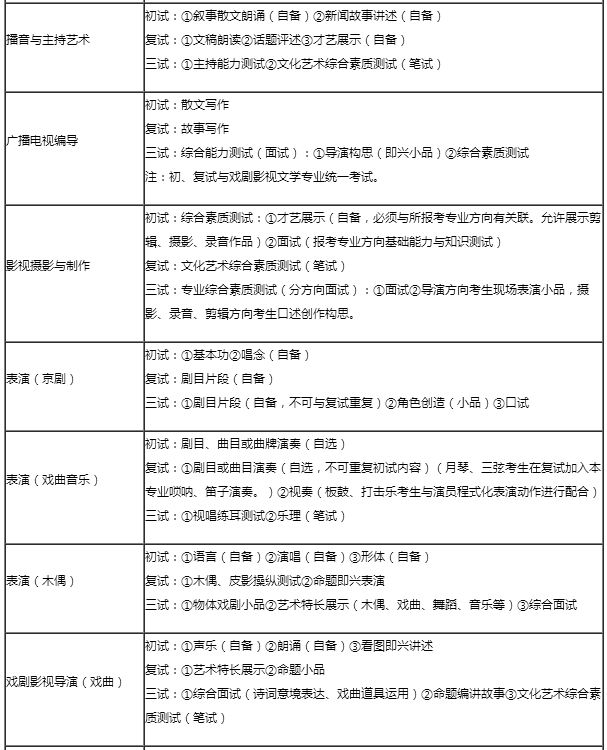 3.戲劇影視文學、戲劇影視文學(教育戲劇)、廣播電視編導三個專業(方向)初、復試統一考試,三試分別面試。