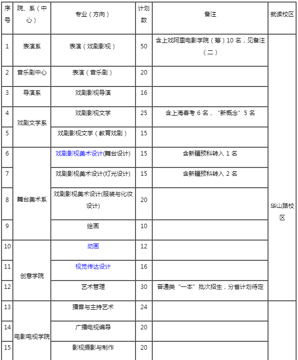 (四)關于計劃科類:表演(戲劇影視、音樂劇)按教育部批準的分省市分專業計劃錄取,各專業方向內不分文理,統一排序、計劃共用。其他校考專業(方向)不分文理,全國統招。