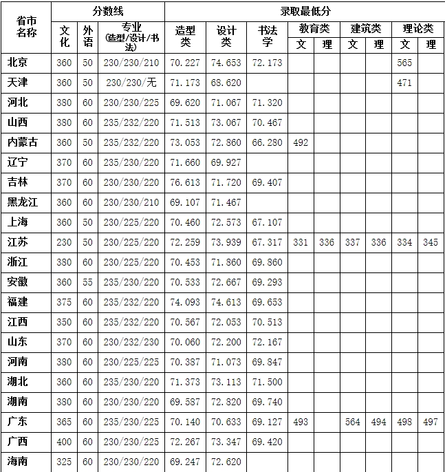 (2)藝術教育、藝術史論、美術學、藝術設計學、建筑學、風景園林專業的錄取,在外語單科成績和高考文化考試成績達到我校劃定的分數線后,按照高考文化成績從高分到低分排序擇優錄取。
