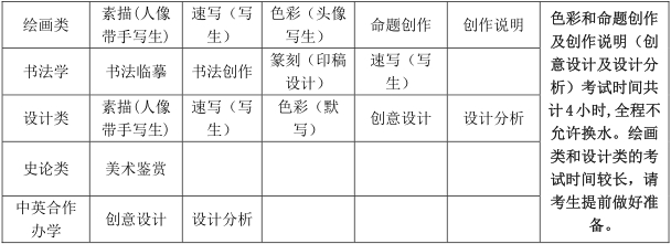 5、考試時間:素描、色彩:3 小時;速寫:15 分鐘;命題創作及說明(創意設計及分析):1小時;中英合作辦學創意設計及分析:2 小時;書法臨摹:1 小時 45 分鐘;書法創作:1 小時;篆刻(印稿設計):1 小時;美術鑒賞:3 小時。