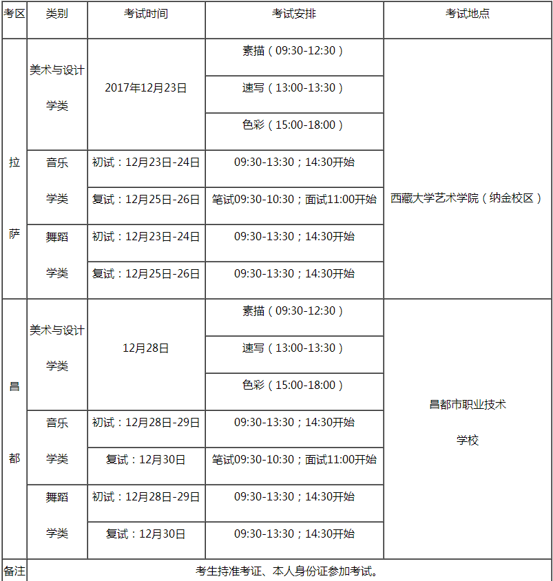 我區藝術加試設拉薩和昌都兩個考區,考生自主選擇考區。憑有效登記表、身份證原件及復印件領取準考證。準考證領取地點:拉薩考區為西藏大學藝術學院(納金校區),昌都考區為昌都市教育(體育)局招生辦。考生準考證領取時間:2017年12月21日至22日(9:30—18:30)。
